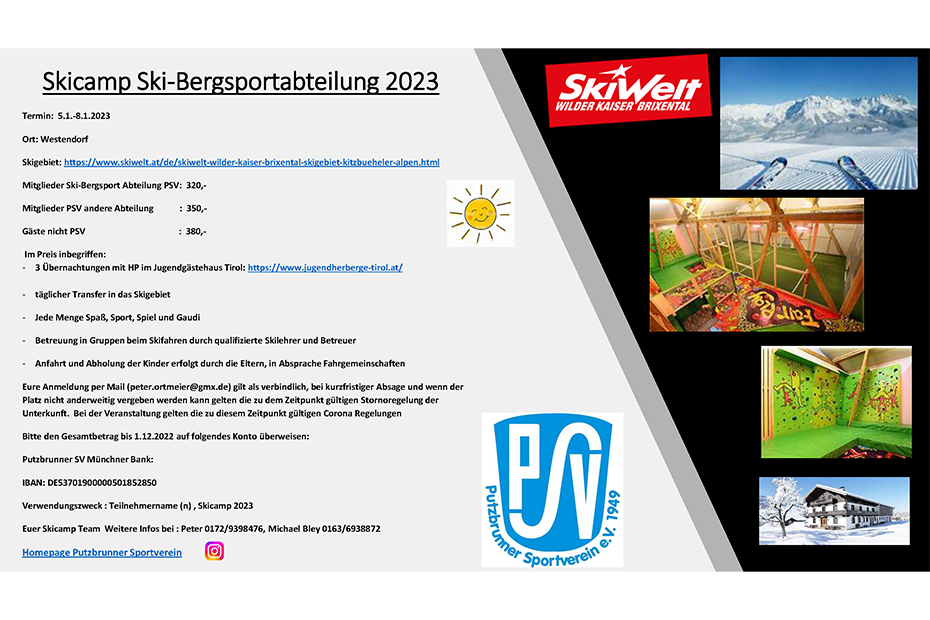 Es ist soweit, das legendäre Skicamp der Ski- Bergsportabteilung kann wieder stattfinden. Termin: 5.1.-8.1.2023 Ort: Westendorf Skigebiet: https://www.skiwelt.at/de/skiwelt-wilder-kaiser-brixental-skigebiet-kitzbueheler-alpen.html Mitglieder Ski-Bergsport Abteilung PSV: 320,- Mitglieder PSV andere Abteilung : 350,- Gäste nicht PSV : 380,- Im Preis inbegriffen: – 3 Übernachtungen… Weiterlesen »Skicamp 2023