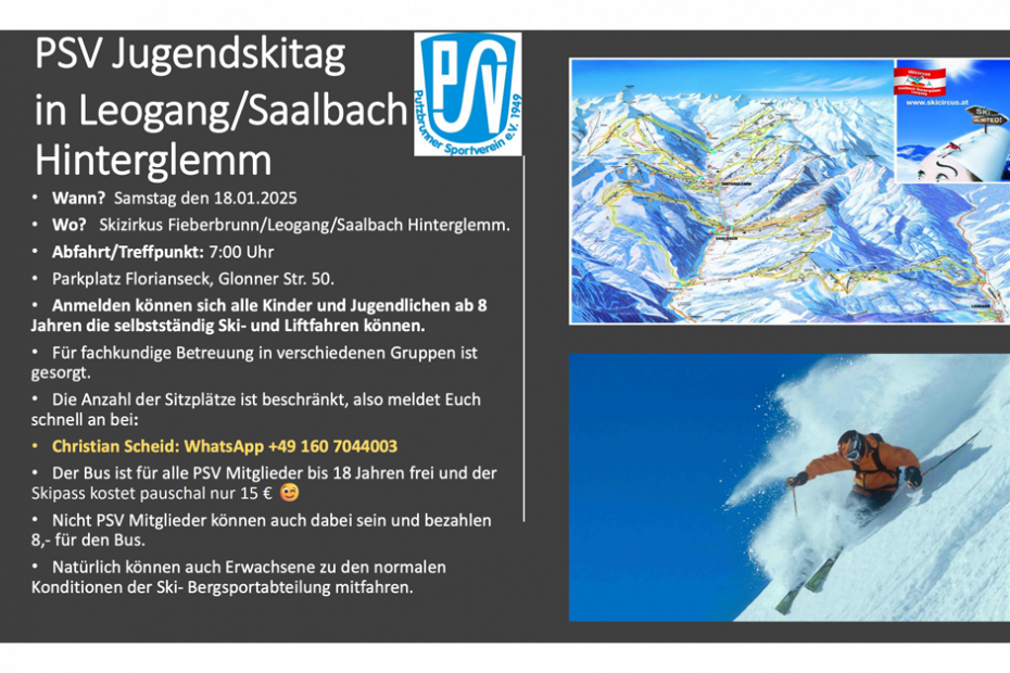 Skitag für Kinder und Jugendliche Wann? Samstag, den 18.01.2025 Wo? Skizirkus Fieberbrunn / Leogang / Saalbach Hinterglemm Abfahrt/Treffpunkt: 7:00 Uhr Ort: Parkplatz …