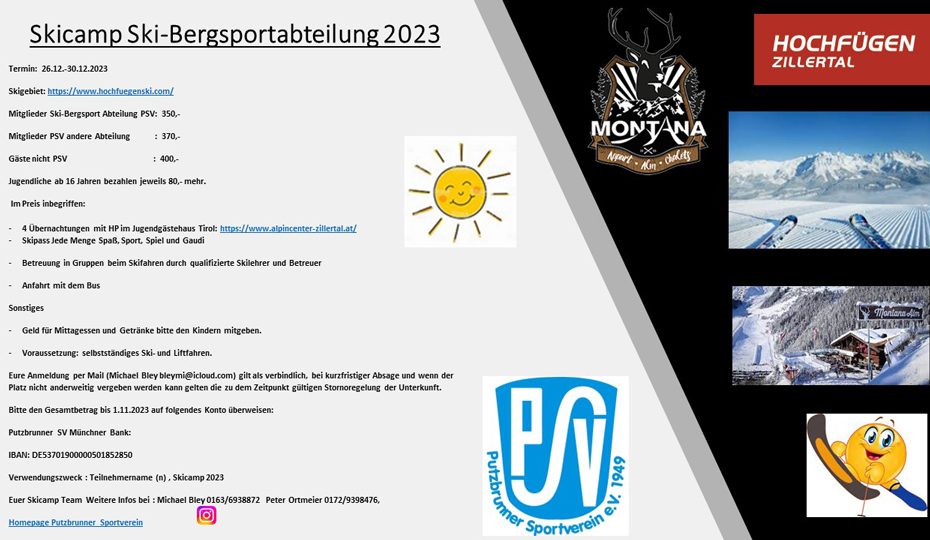 Termin: 26.12.-30.12.2023 Skigebiet: https://www.hochfuegenski.com/ Mitglieder Ski-Bergsport Abteilung PSV: 350,- Mitglieder PSV andere Abteilung : 370,- Gäste nicht PSV : 400,- Jugendliche ab …