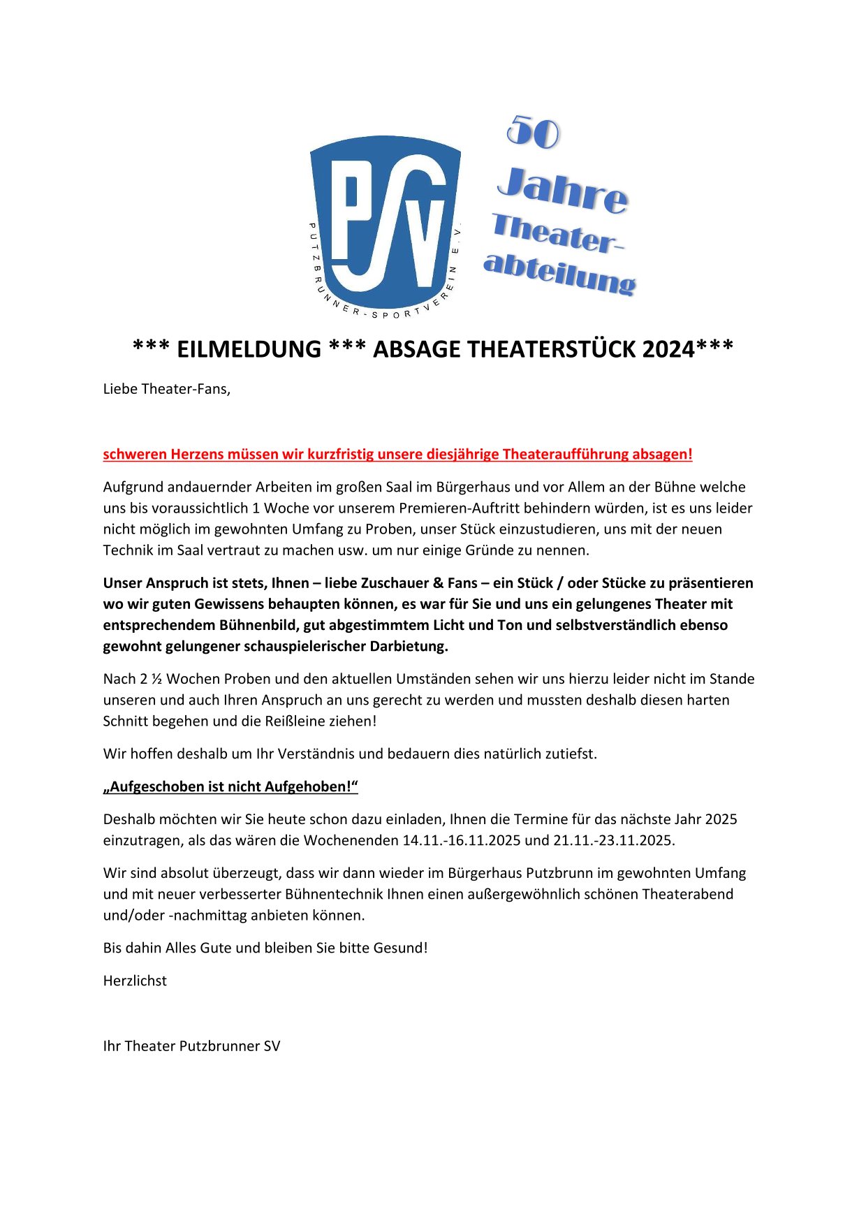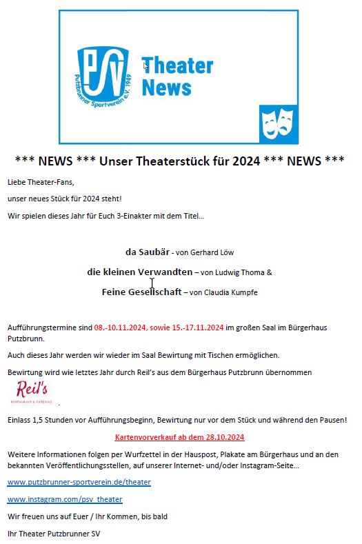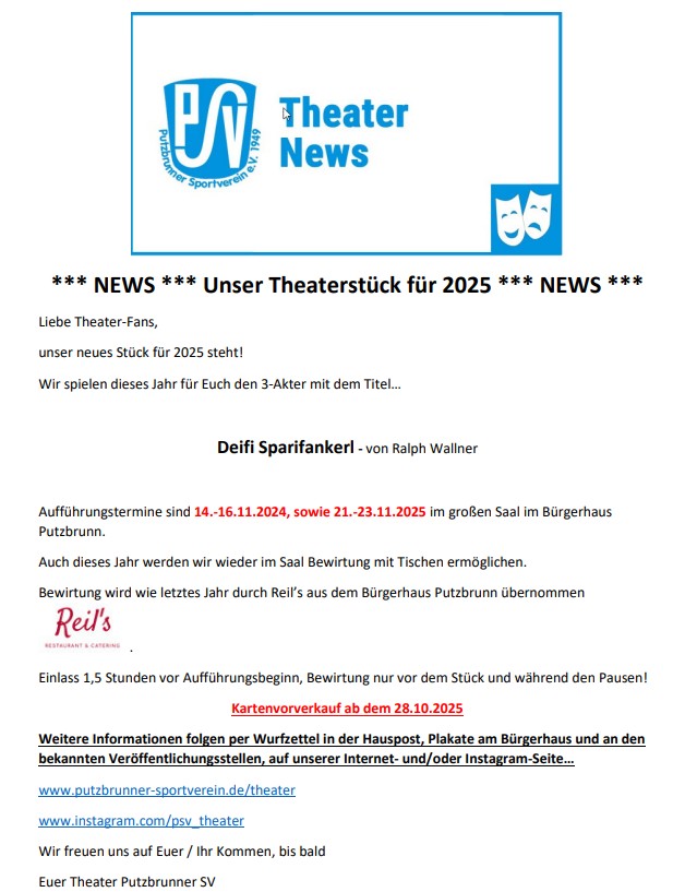 Wir freuen uns auf Ihr/Euer kommen! Eure Theaterabteilung Putzbrunner SV