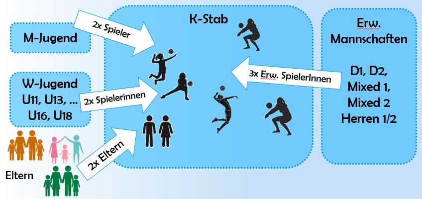Darüber hinaus wird ein Koordinierungsstab gebildet, in dem Jugendleiter gemeinsam mit Erwachsenenspielern als auch Eltern und Jugendspielerinnen den M/W-Jugendvolleyball im PSV organisiert. Der K-Stab („key staff“) soll ca. 8-9 Personen umfassen und die Hallenpläne, Trainerpool und die Entwicklung der Jugendmannschaften übergreifend zu gestalten. Hier sind Strategie, Weitblick, mittel-/langfristige Planung, neue Ideen und Kreativität der Jugend gefragt.